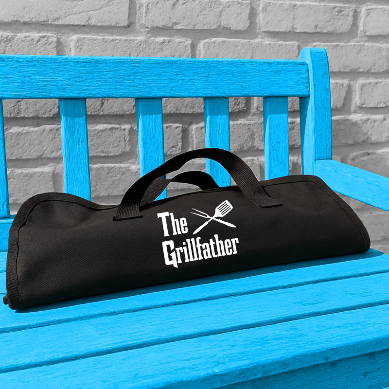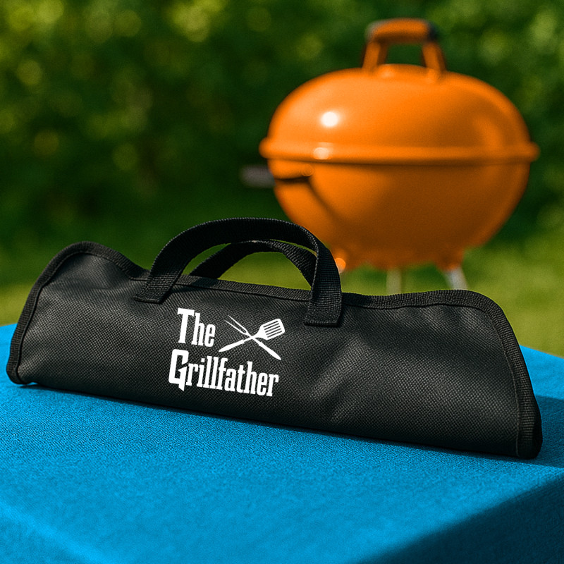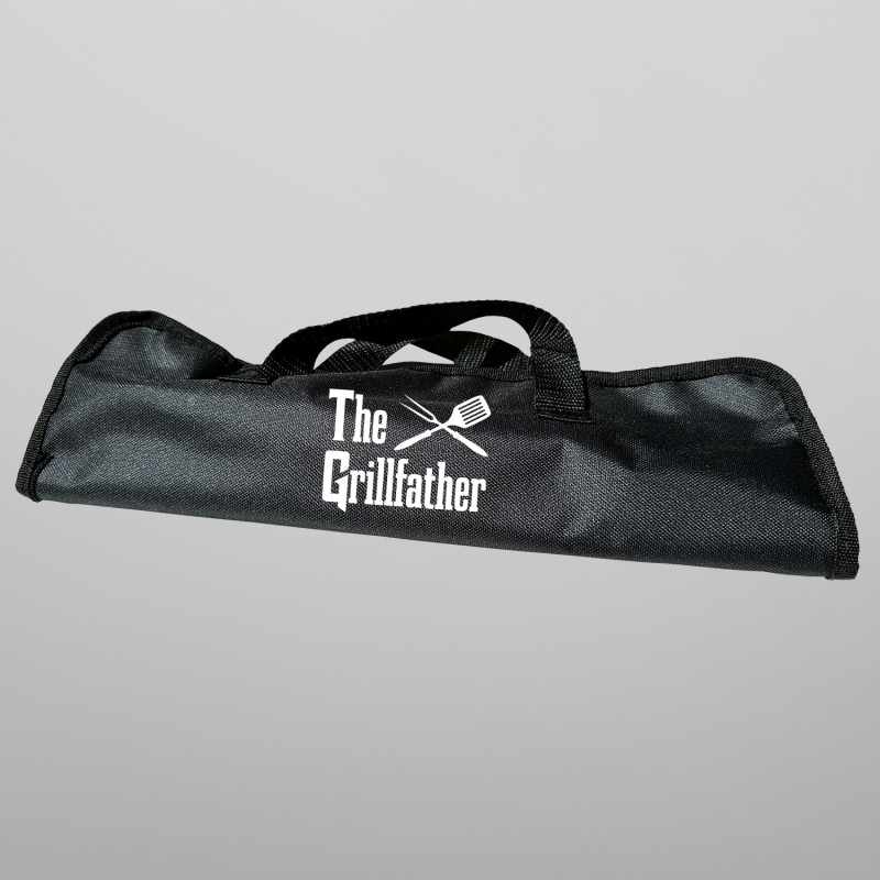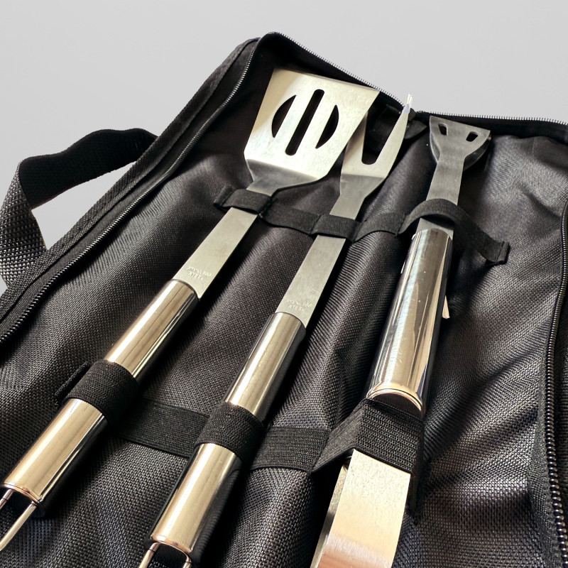 Trojdielna sada náradia na gril v elegantnom puzdre s potlačou. Ideálny tip na darček pre každého milovníka grilovania. V sade nájdete vidličku, obracačku a kliešte, vyrobené z odolnej nehrdzavejúcej ocele, v čiernom nylonovom puzdre s rozmermi 410×270 mm.