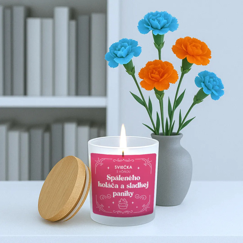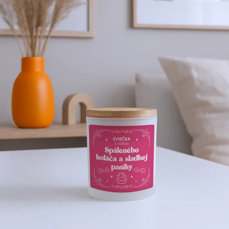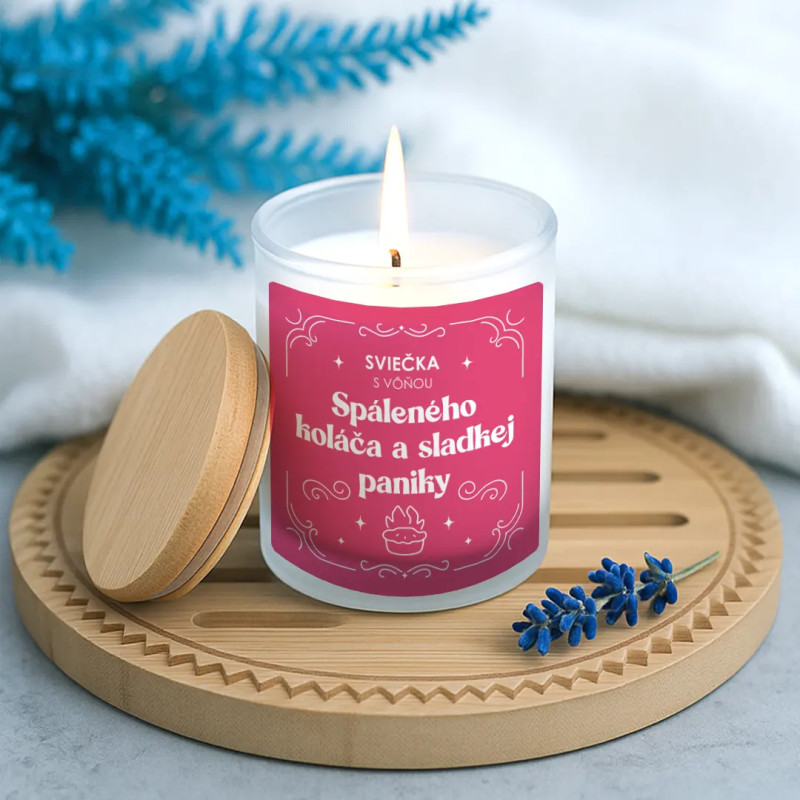 Sviečka s vôňou spáleného koláča a sladkej paniky - vonná svieca s potlačou