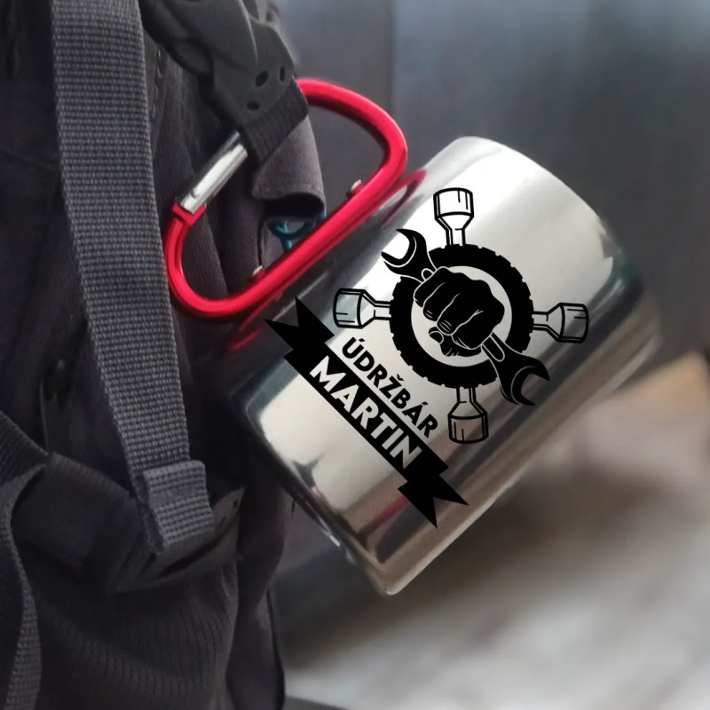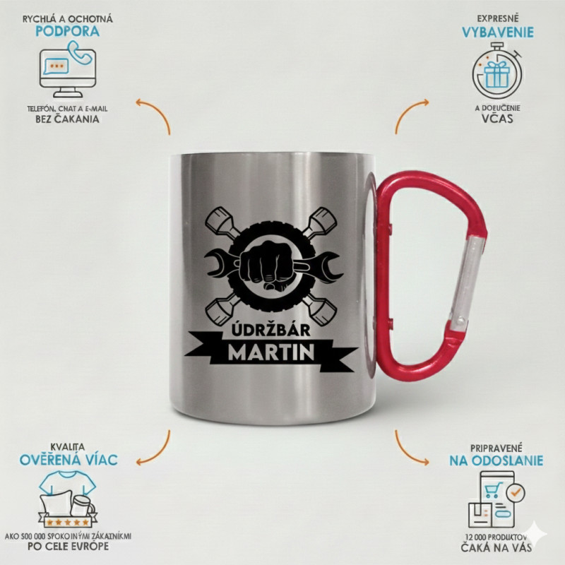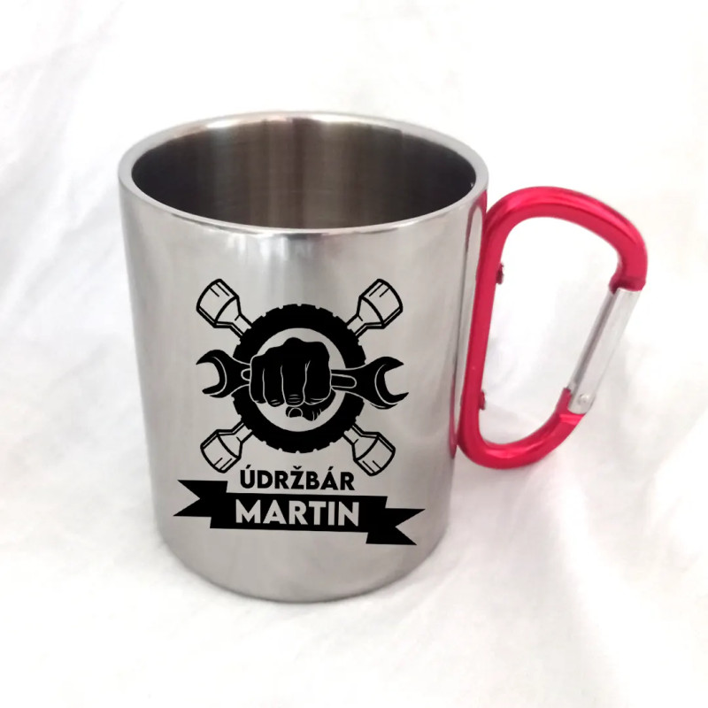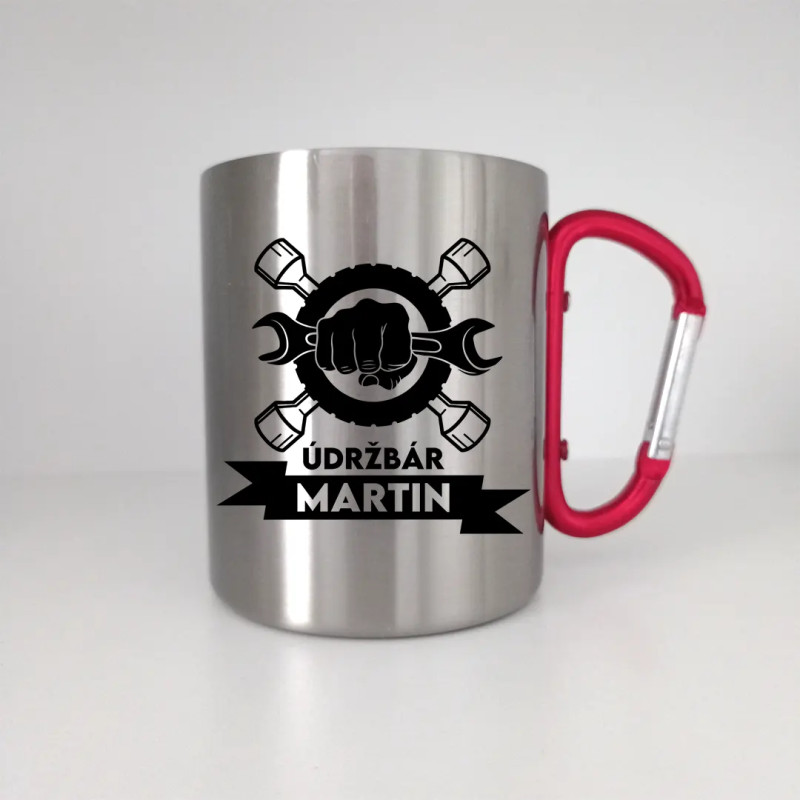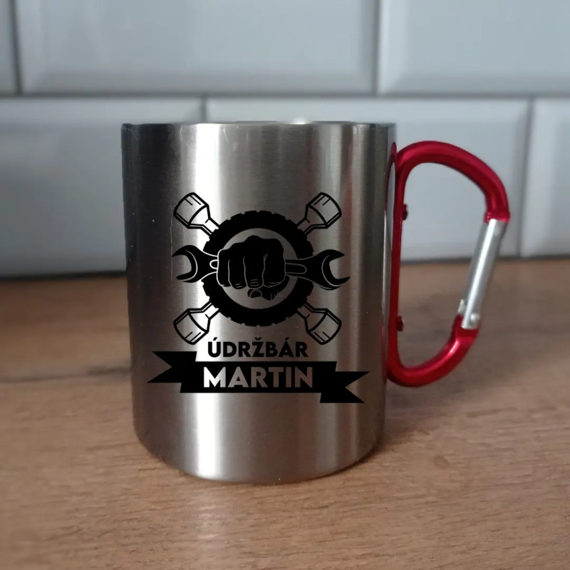 Kovový hrnček s červenou karabínkou. Ideálne pre Teba alebo ako darček pre Tebe blízku osobu.